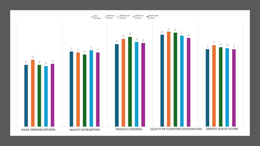 In light of the above, we would like to share the mystery shopper evaluation results covering the four quarters of 2023 and 2024. The data in this graph illustrate how mystery shopper assessments have evolved over four main categories over time.