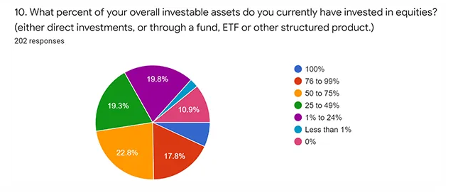 Given that equities are currently at all-time highs, this “risk-aware, not risk-averse” mindset shows up in asset allocation. Although women have historically been seen as badly underweight in equity investing, just under half of survey respondents indicated that more than 50% of their investable assets are currently in stocks, whether through shares, funds, or exchange-traded funds (ETFs), and a quarter say their equity exposure is over 75%.