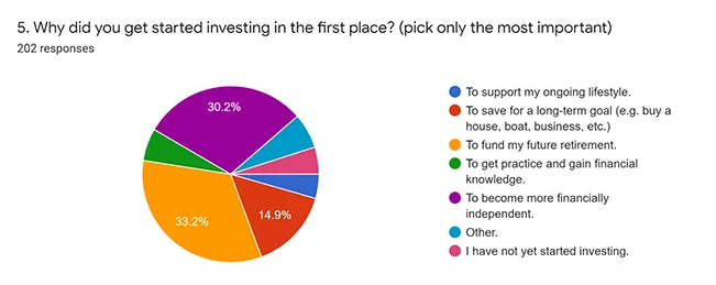 But only a fifth of survey respondents said they began investing because of a course (10%) or a book (9%). Most credited mentors (18%), family and friends (8%), or self-service online/social trading (18%). That said, there are many ways to get started: The survey gave respondents seven different pre-set responses, yet nearly 30% picked “Other.”