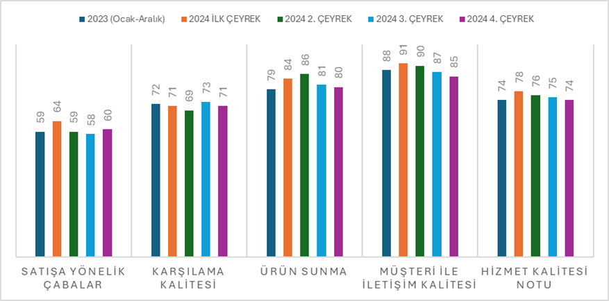 Yukarıda paylaştıklarımızın ışığında, 2023 yılı ve 2024 yılı dört çeyreği kapsayan gizli müşteri değerlendirme sonuçları paylaşmak istiyoruz. Bu grafikte yer alan veriler, gizli müşteri değerlendirmelerinin 4 ana kategoride dönemsel olarak nasıl değiştiğini göstermektedir.